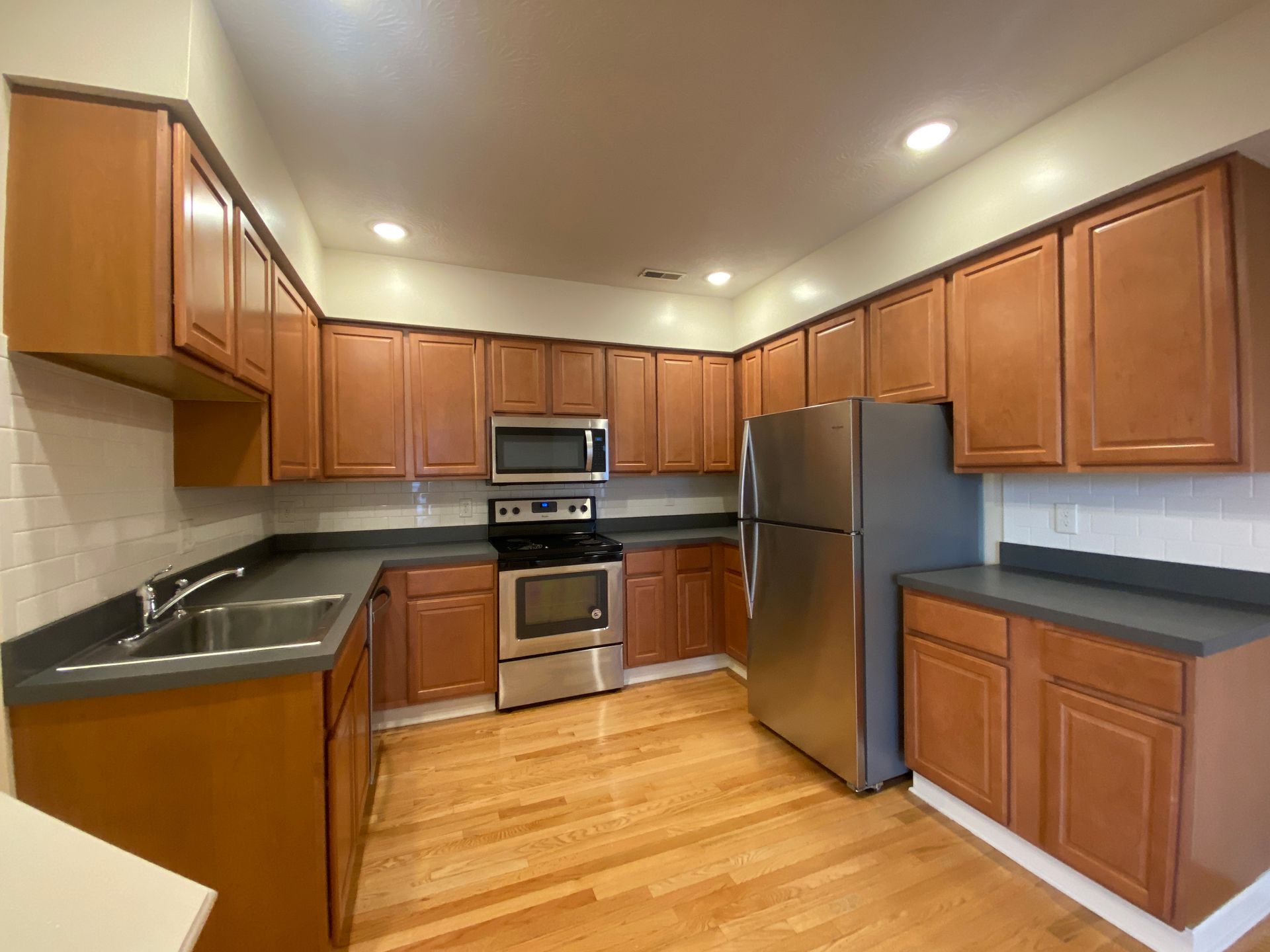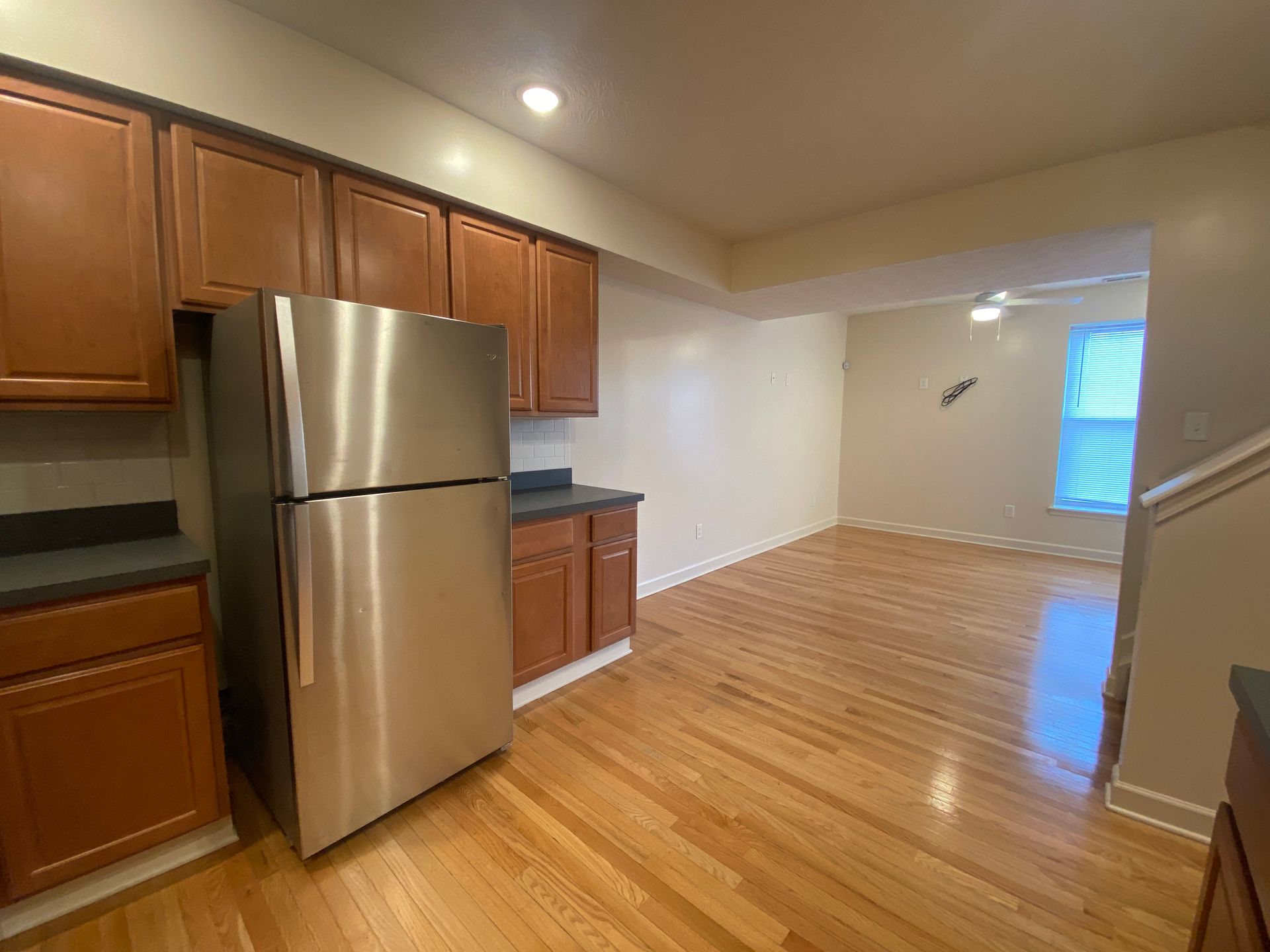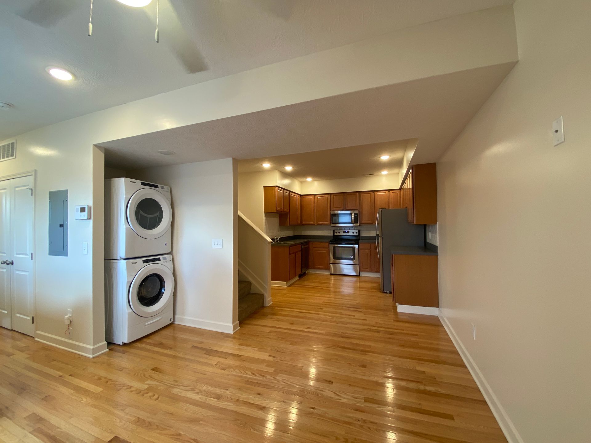 Remodeled four bedroom townhouse with stainless steel appliances (range, refrigerator, dishwasher, microhood), in unit laundry, central air, off street parking, and ceiling fans.