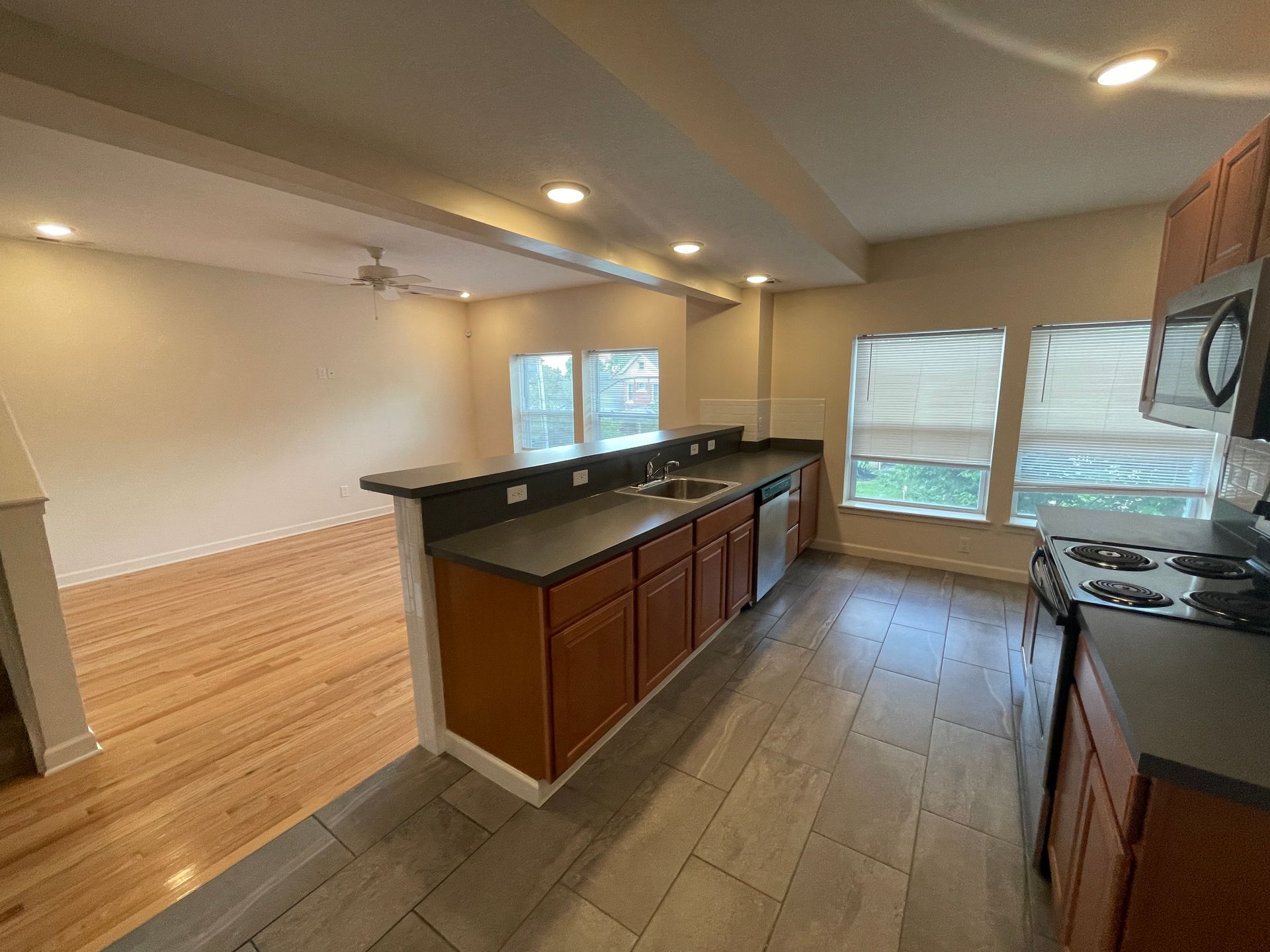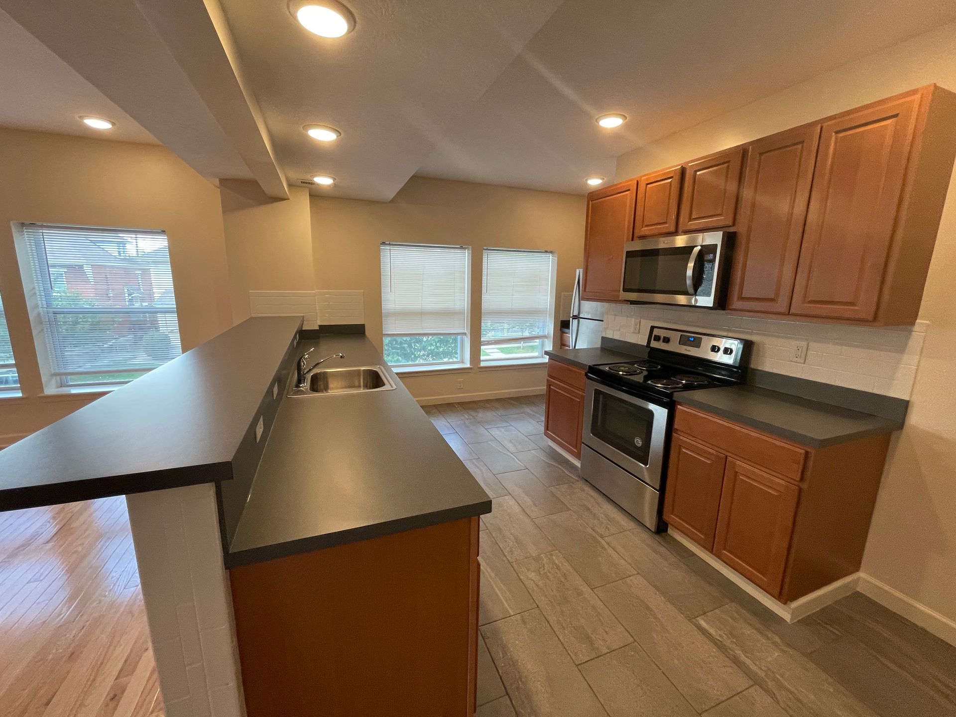 Remodeled four bedroom, three bath townhouse with stainless steel appliances (range, refrigerator, dishwasher, microhood), washer/dryer, central air, off street parking, and ceiling fans.