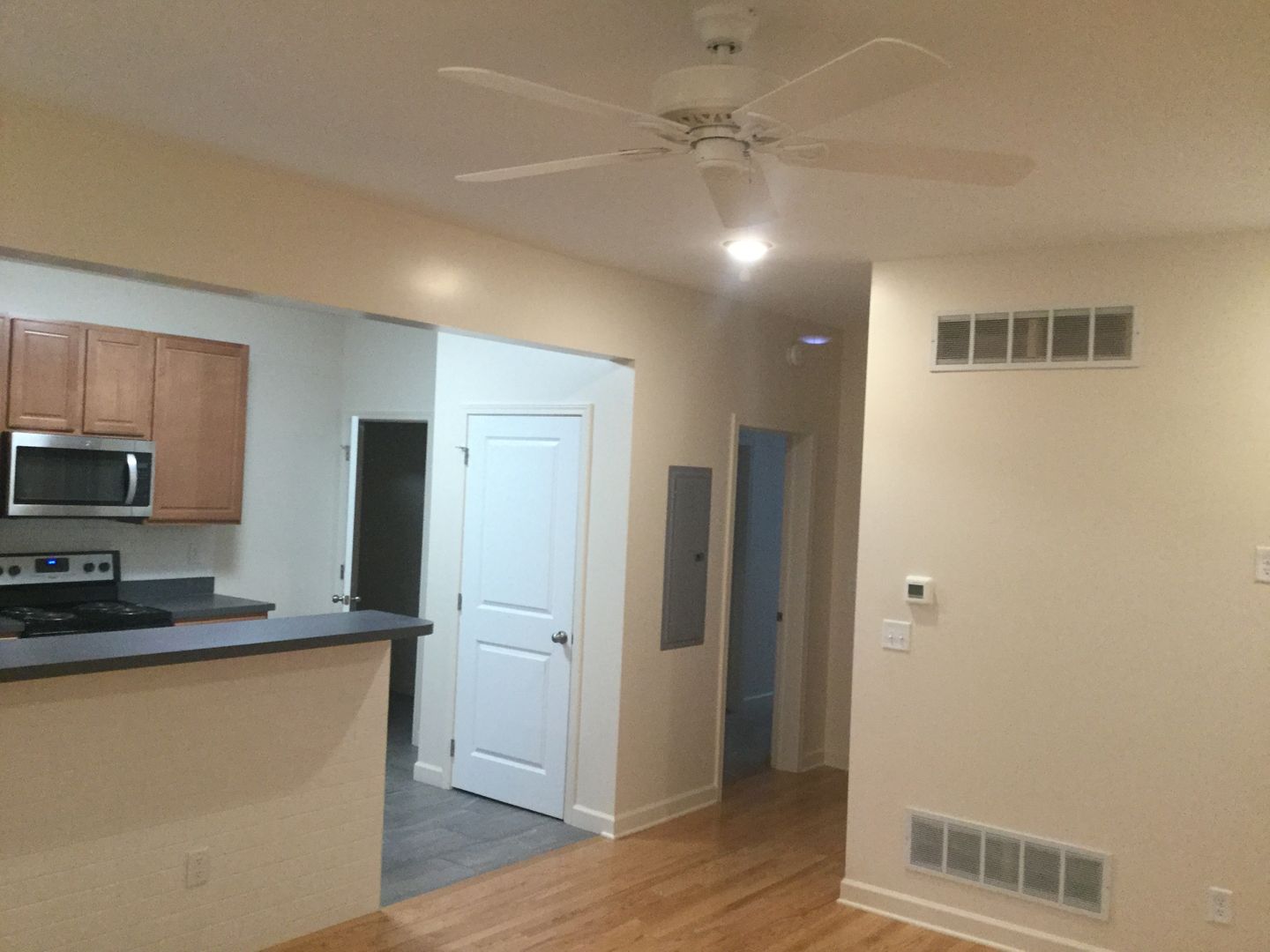 Fully renovated two bedroom flat with stainless steel appliances (range, refrigerator, dishwasher, microhood), in unit laundry, central air, off street parking, and ceiling fans.